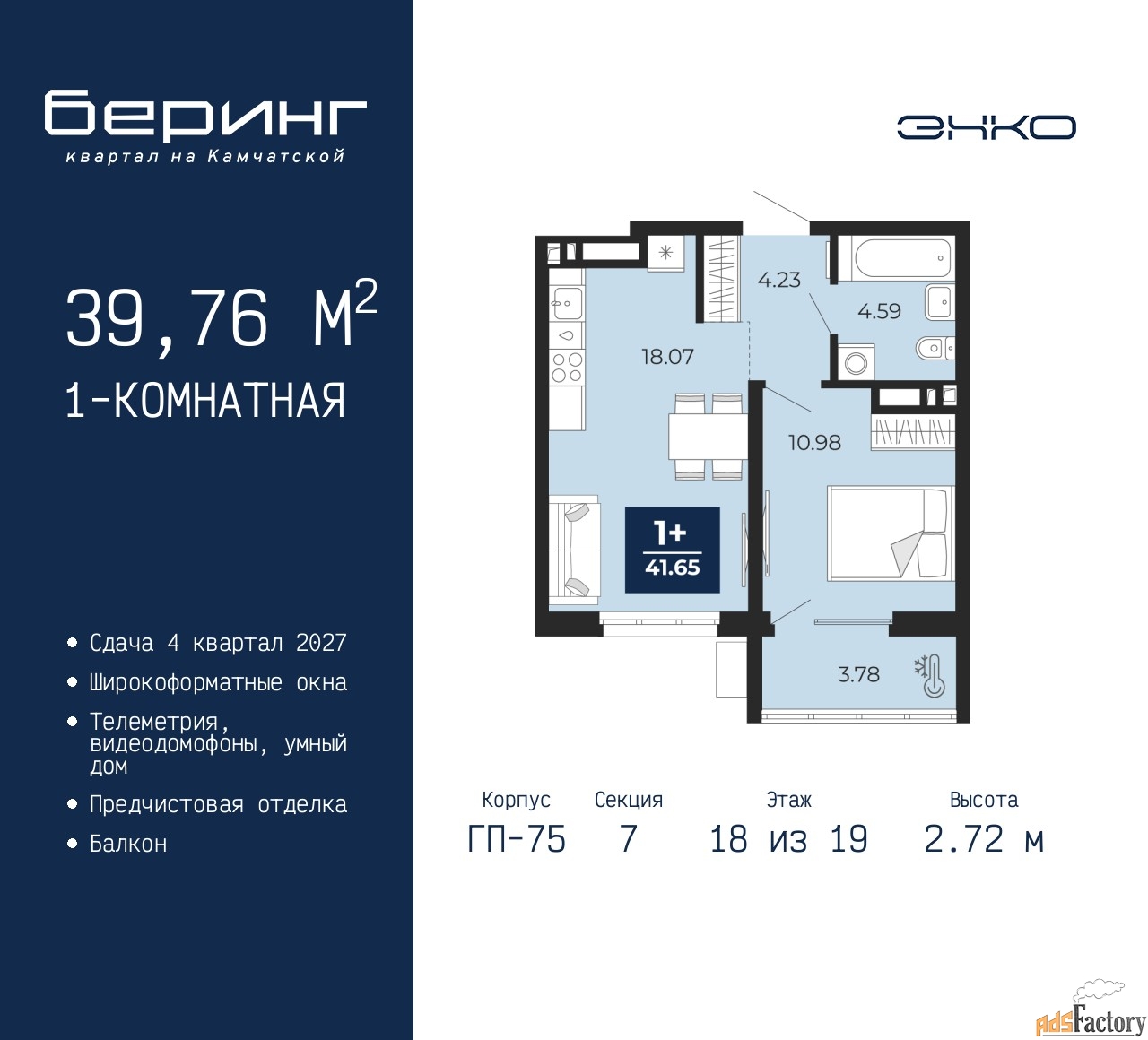 Дом монолитный, многоподъездный, переменной этажности, от 17 до 24 этажей. Квартира находится в 7-й секции высотой 19 этажей в корпусе ГП-75. На этаже 7 квартир. В подъезде 2 пассажирских и 1 грузовой лифт. Окончание строительства - 4 квартал 2027 года. Оформление сделки по договору долевого участия.
