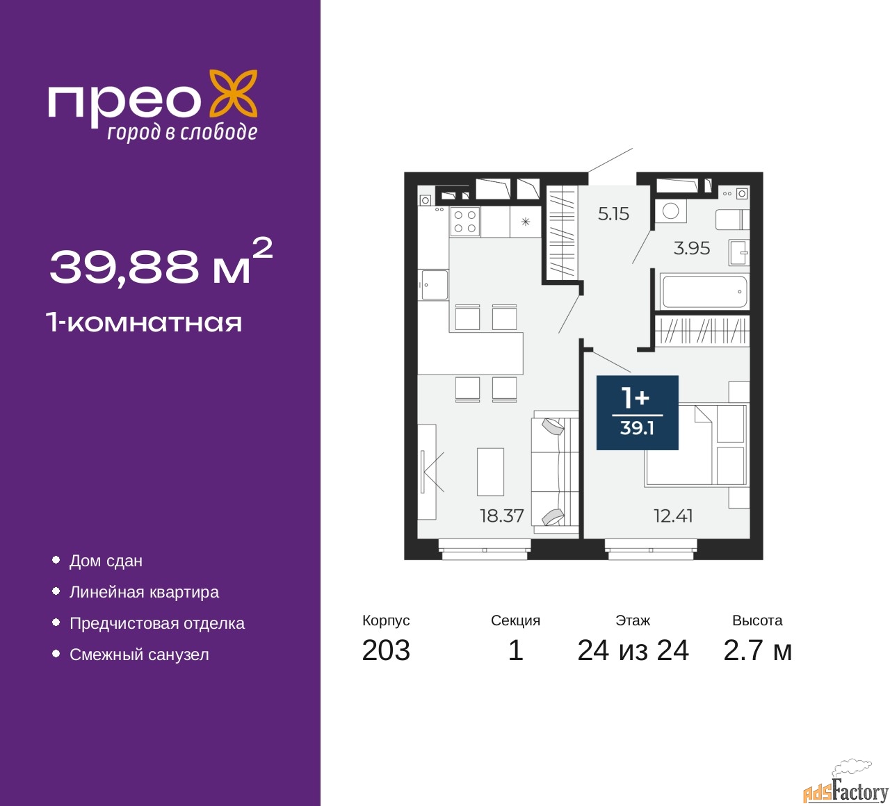 Квартира находится в корпусе 203. Дом монолитный, одноподъездный, высотой 24 этажа. На этаже 14 квартир. В подъезде 2 грузовых лифта. В настоящее время строительство окончено, дом сдан в 4 квартале 2024 года. Оформление сделки по договору купли-продажи.