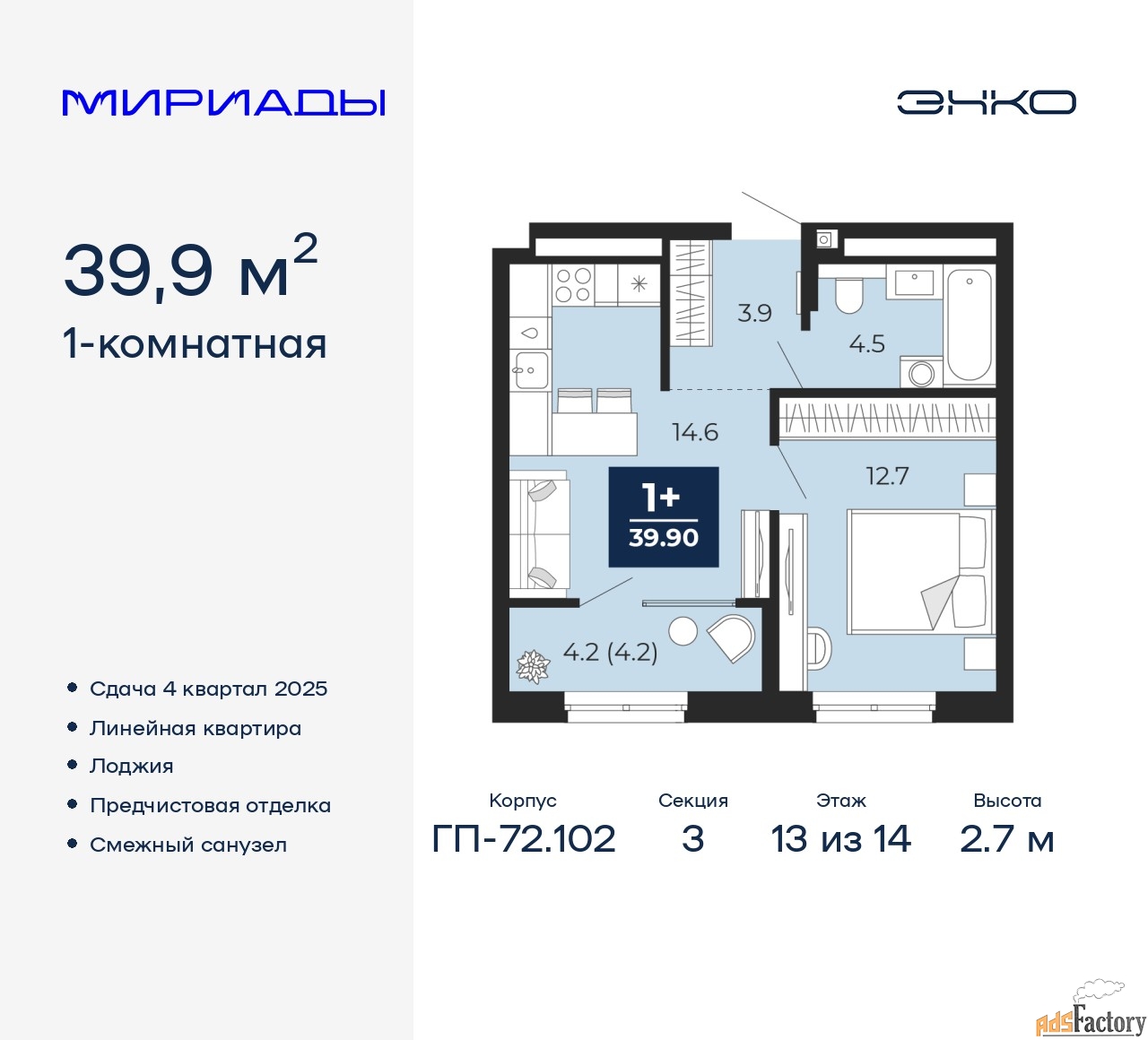 Дом монолитный, многоподъездный, переменной этажности, от 14 до 16 этажей. Квартира находится в 3-й секции высотой 14 этажей в корпусе ГП-72.102. На этаже 5 квартир. В подъезде 1 пассажирский и 1 грузовой лифт. Окончание строительства - 4 квартал 2025 года. Оформление сделки по договору долевого участия.