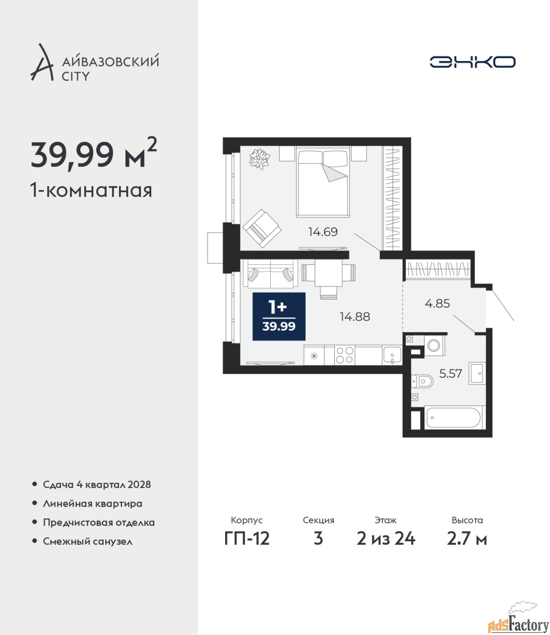 Дом монолитный, многоподъездный, высотой 24 этажа. Квартира находится в 3-й секции в корпусе ГП-12. На этаже 6 квартир. В подъезде 1 пассажирский и 1 грузовой лифт. Окончание строительства - 4 квартал 2028 года. Оформление сделки по договору долевого участия.