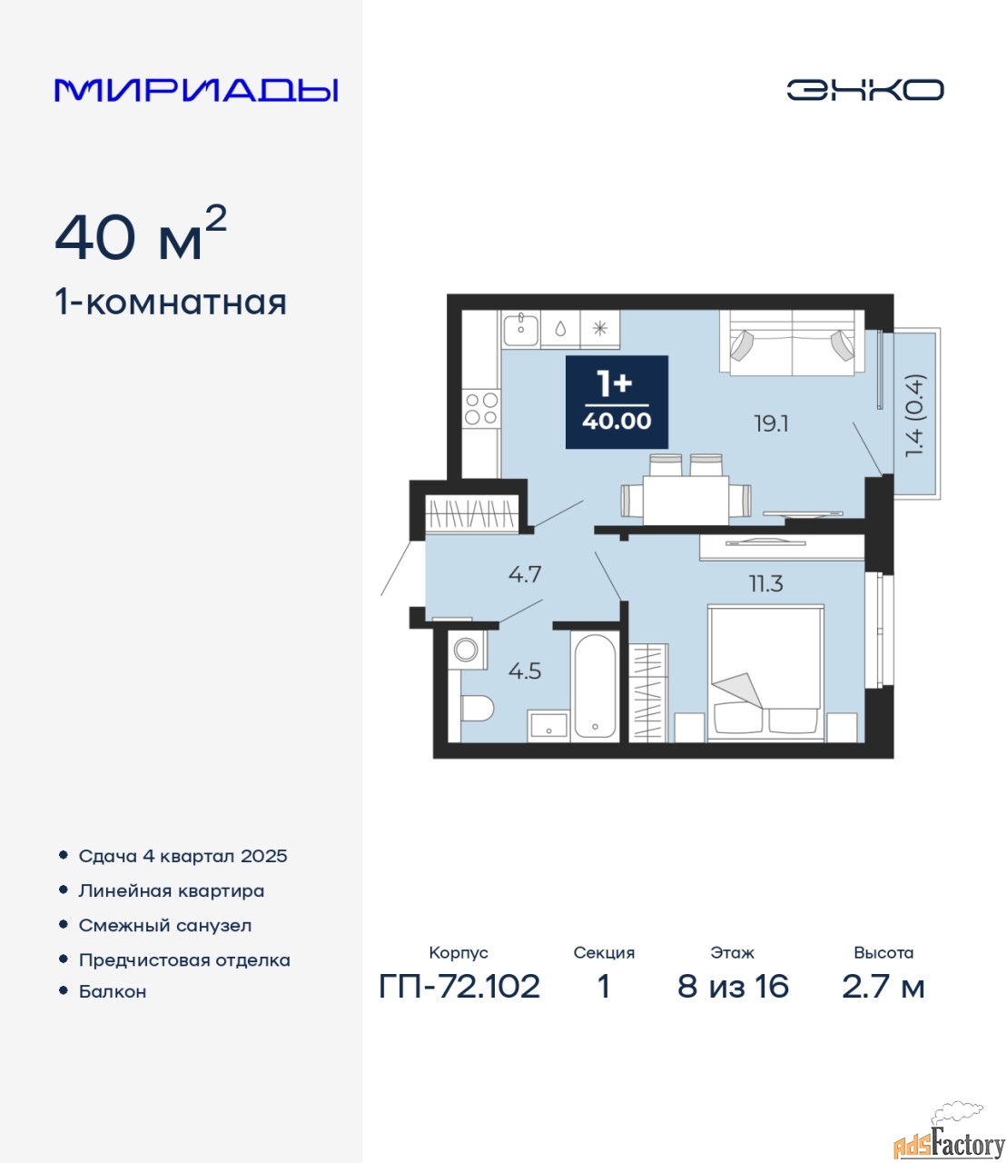 Дом монолитный, многоподъездный, переменной этажности, от 14 до 16 этажей. Квартира находится в 1-й секции высотой 16 этажей в корпусе ГП-72.102. На этаже 9 квартир. В подъезде 1 пассажирский и 1 грузовой лифт. Окончание строительства - 1 квартал 2026 года. Оформление сделки по договору долевого участия.