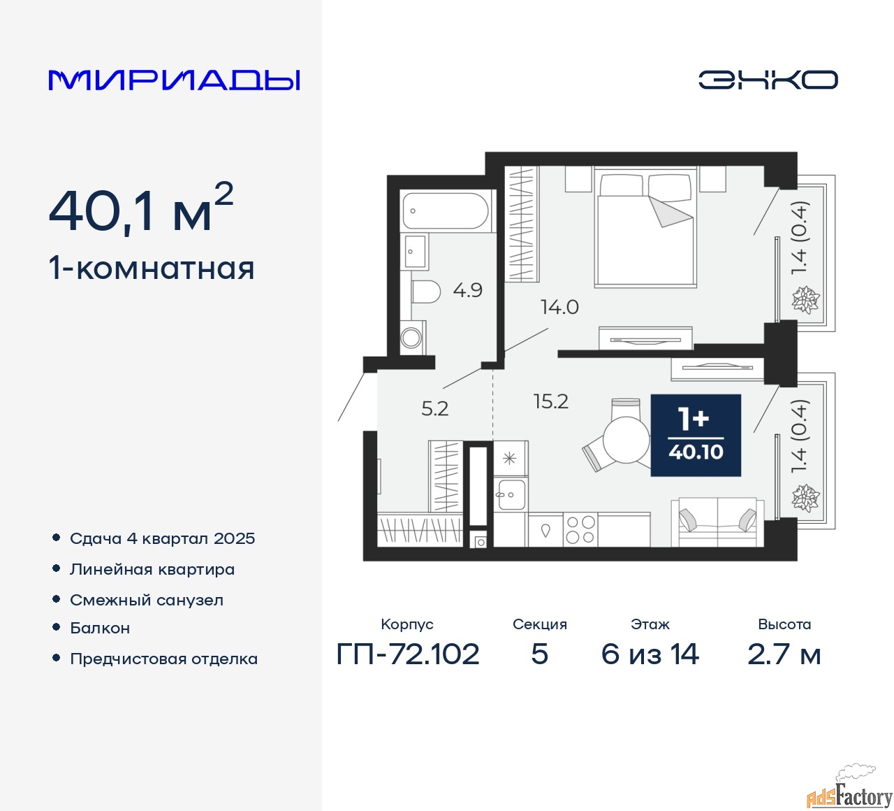 Дом монолитный, многоподъездный, переменной этажности, от 14 до 16 этажей. Квартира находится в 5-й секции высотой 14 этажей в корпусе ГП-72.102. На этаже 8 квартир. В подъезде 1 пассажирский и 1 грузовой лифт. Окончание строительства - 4 квартал 2025 года. Оформление сделки по договору долевого участия.