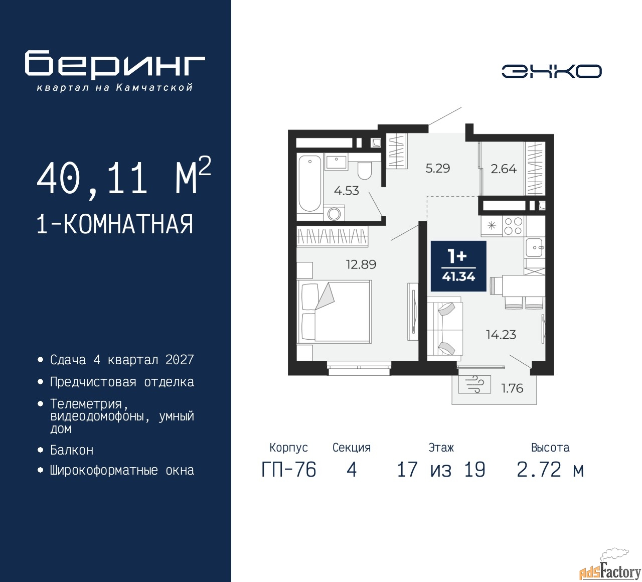 Дом монолитный, черырехподъездный, переменной этажности, от 19 до 24 этажей. Квартира находится в 4-й секции высотой 19 этажей в корпусе ГП-76. На этаже 5 квартир. В подъезде 1 пассажирский и 1 грузовой лифт. Окончание строительства - 4 квартал 2027 года. Оформление сделки по договору долевого участия.
