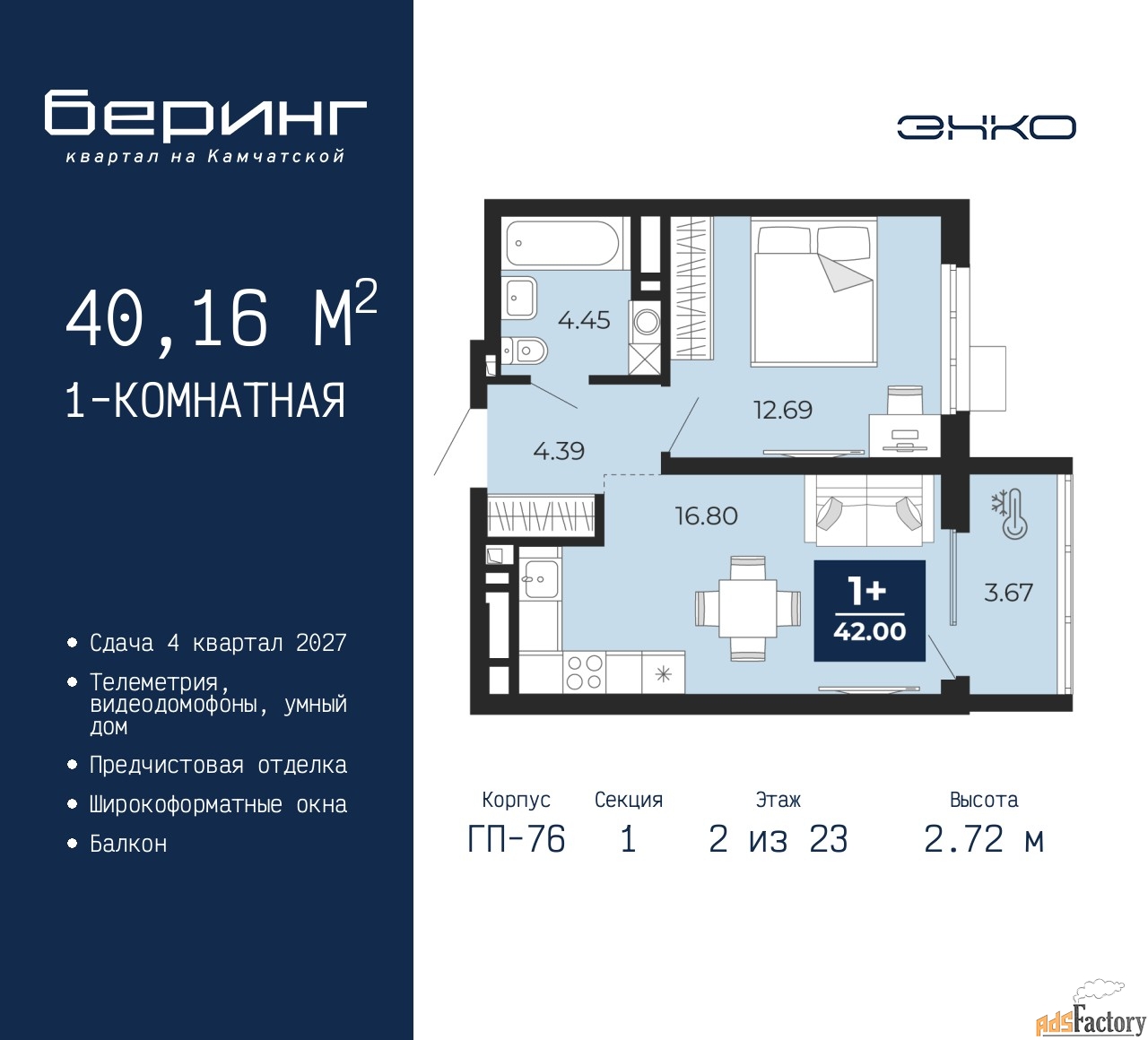 Дом монолитный, черырехподъездный, переменной этажности, от 19 до 24 этажей. Квартира находится в 1-й секции высотой 23 этажа в корпусе ГП-76. На этаже 7 квартир. В подъезде 2 пассажирских и 1 грузовой лифт. Окончание строительства - 4 квартал 2027 года. Оформление сделки по договору долевого участия.