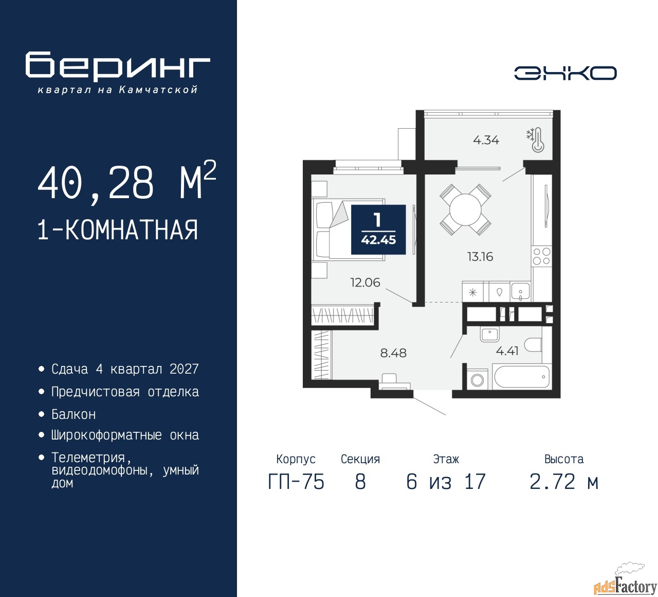 | Высота потолков (м.) | 2.72 |