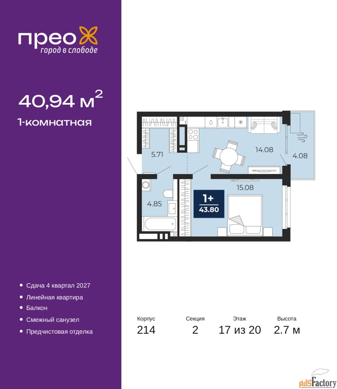 Дом монолитный, двухподъездный, переменной этажности, от 12 до 20 этажей. Квартира находится во 2-й секции высотой 20 этажей в корпусе 214. На этаже 8 квартир. В подъезде 1 пассажирский и 1 грузовой лифт. Окончание строительства - 4 квартал 2027 года. Оформление сделки по договору долевого участия.
