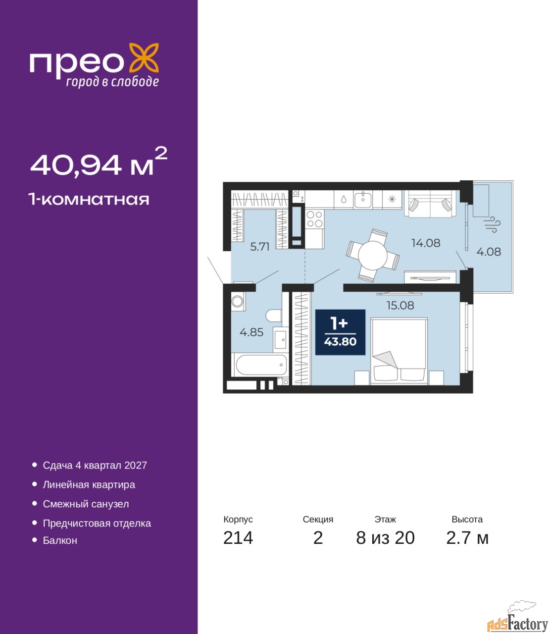 Дом монолитный, двухподъездный, переменной этажности, от 12 до 20 этажей. Квартира находится во 2-й секции высотой 20 этажей в корпусе 214. На этаже 8 квартир. В подъезде 1 пассажирский и 1 грузовой лифт. Окончание строительства - 4 квартал 2027 года. Оформление сделки по договору долевого участия.