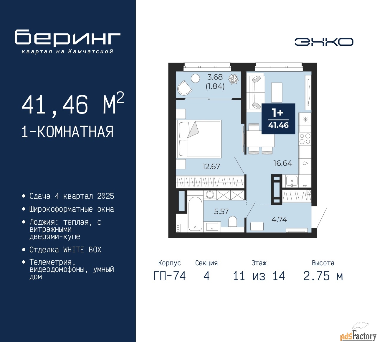 Дом монолитный, многоподъездный, переменной этажности, от 9 до 21 этажей. Квартира находится в 4-й секции высотой 14 этажей в корпусе ГП-74. На этаже 7 квартир. В подъезде 1 пассажирский и 1 грузовой лифт. Окончание строительства - 4 квартал 2025 года. Оформление сделки по договору долевого участия.