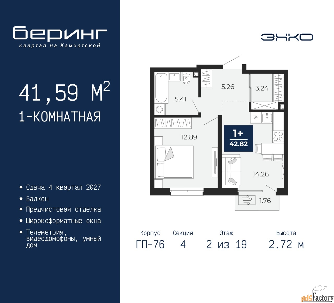 Дом монолитный, черырехподъездный, переменной этажности, от 19 до 24 этажей. Квартира находится в 4-й секции высотой 19 этажей в корпусе ГП-76. На этаже 5 квартир. В подъезде 1 пассажирский и 1 грузовой лифт. Окончание строительства - 4 квартал 2027 года. Оформление сделки по договору долевого участия.