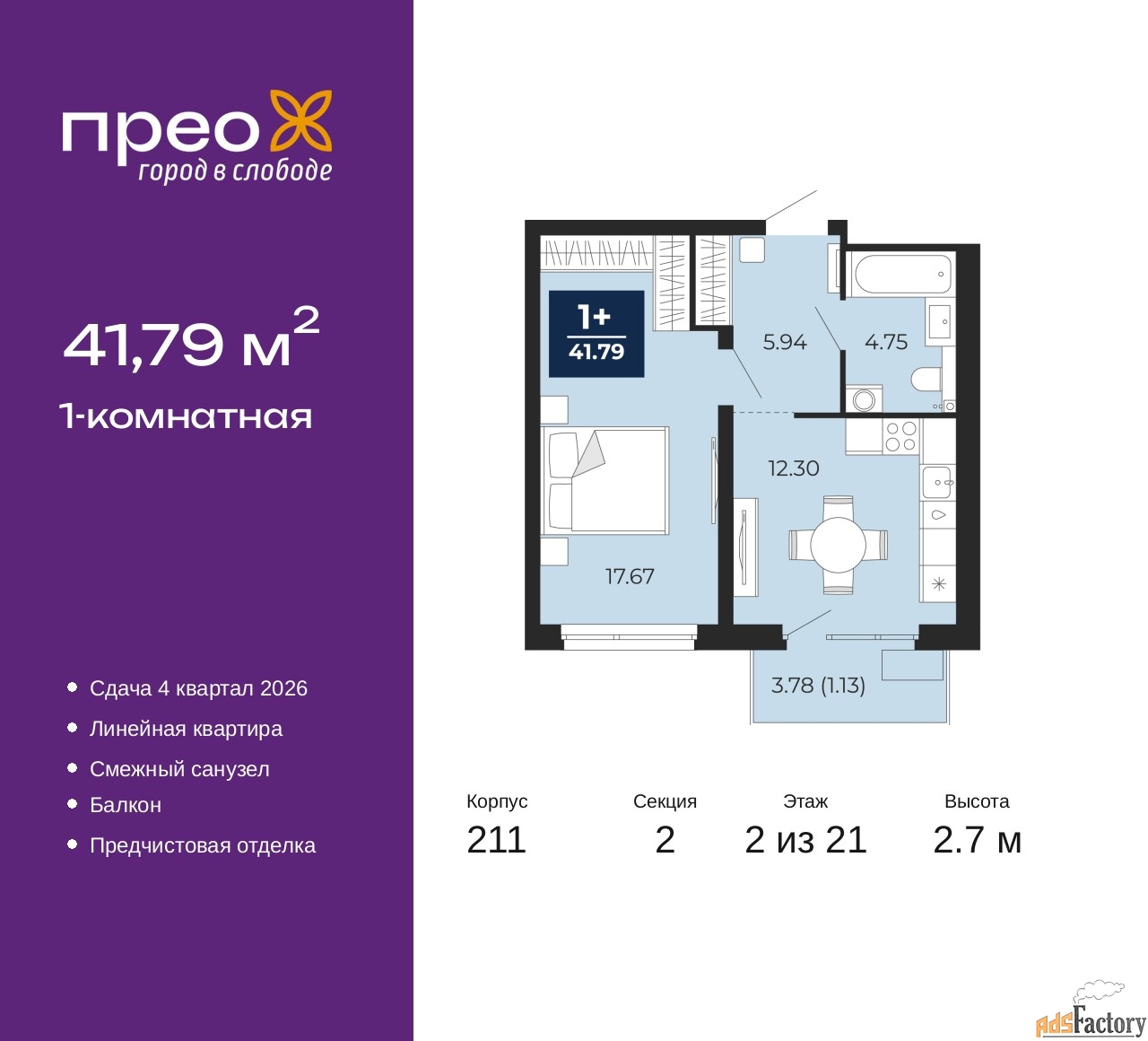 Дом монолитный, черырехподъездный, переменной этажности, от 14 до 21 этажей. Квартира находится во 2-й секции высотой 21 этаж в корпусе 211. На этаже 10 квартир. В подъезде 1 пассажирский и 1 грузовой лифт. Окончание строительства - 4 квартал 2026 года. Оформление сделки по договору долевого участия.