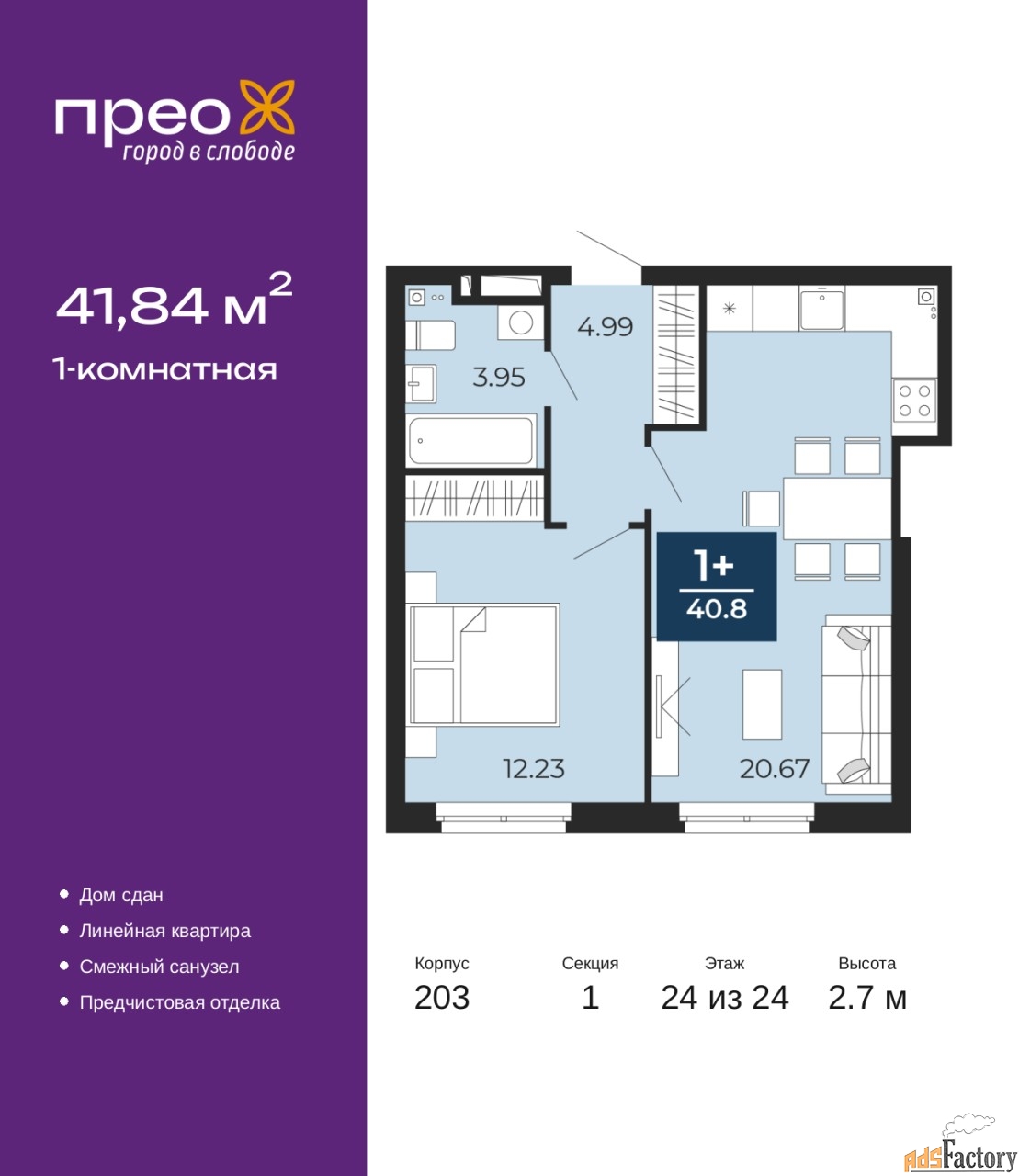 Квартира находится в корпусе 203. Дом монолитный, одноподъездный, высотой 24 этажа. На этаже 14 квартир. В подъезде 2 грузовых лифта. На сегодняшний день строительство окончено, дом сдан в 4 квартале 2024 года. Оформление сделки по договору купли-продажи.