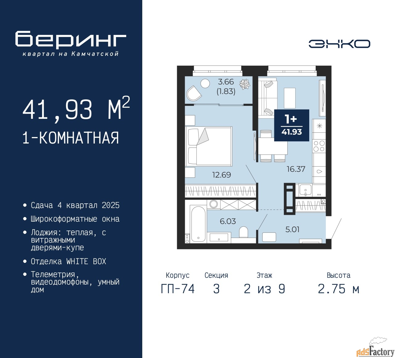 Дом монолитный, многоподъездный, переменной этажности, от 9 до 21 этажей. Квартира находится в 3-й секции высотой 9 этажей в корпусе ГП-74. На этаже 7 квартир. В подъезде 1 грузовой лифт. Окончание строительства - 4 квартал 2025 года. Оформление сделки по договору долевого участия.