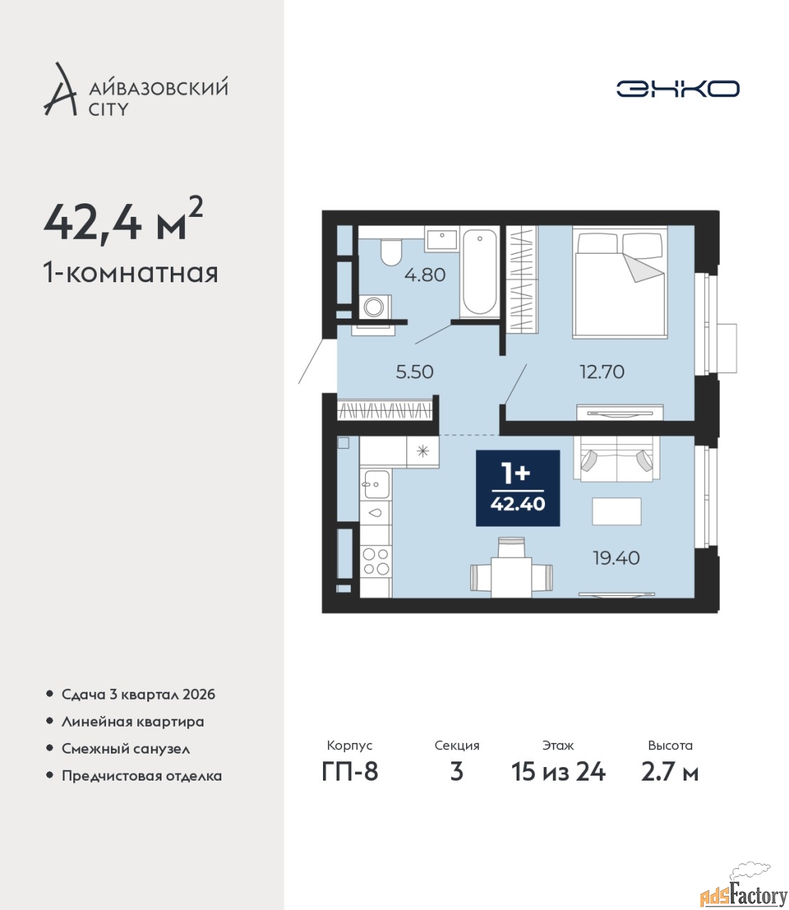 Дом монолитный, многоподъездный, переменной этажности, от 14 до 24 этажей. Квартира находится в 3-й секции высотой 24 этажа в корпусе ГП-8. На этаже 7 квартир. В подъезде 1 пассажирский и 1 грузовой лифт. Окончание строительства - 3 квартал 2026 года. Оформление сделки по договору долевого участия.