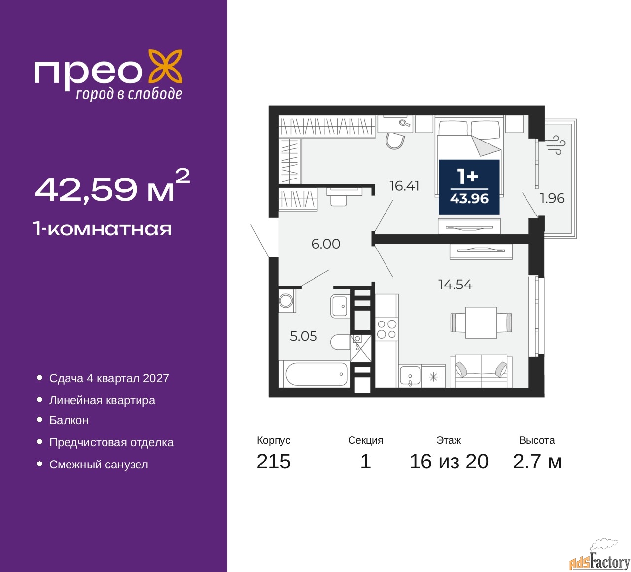 Квартира находится в корпусе 215. Дом монолитный, одноподъездный, высотой 20 этажей. На этаже 8 квартир. В подъезде 1 пассажирский и 1 грузовой лифт. Окончание строительства - 4 квартал 2027 года. Оформление сделки по договору долевого участия.