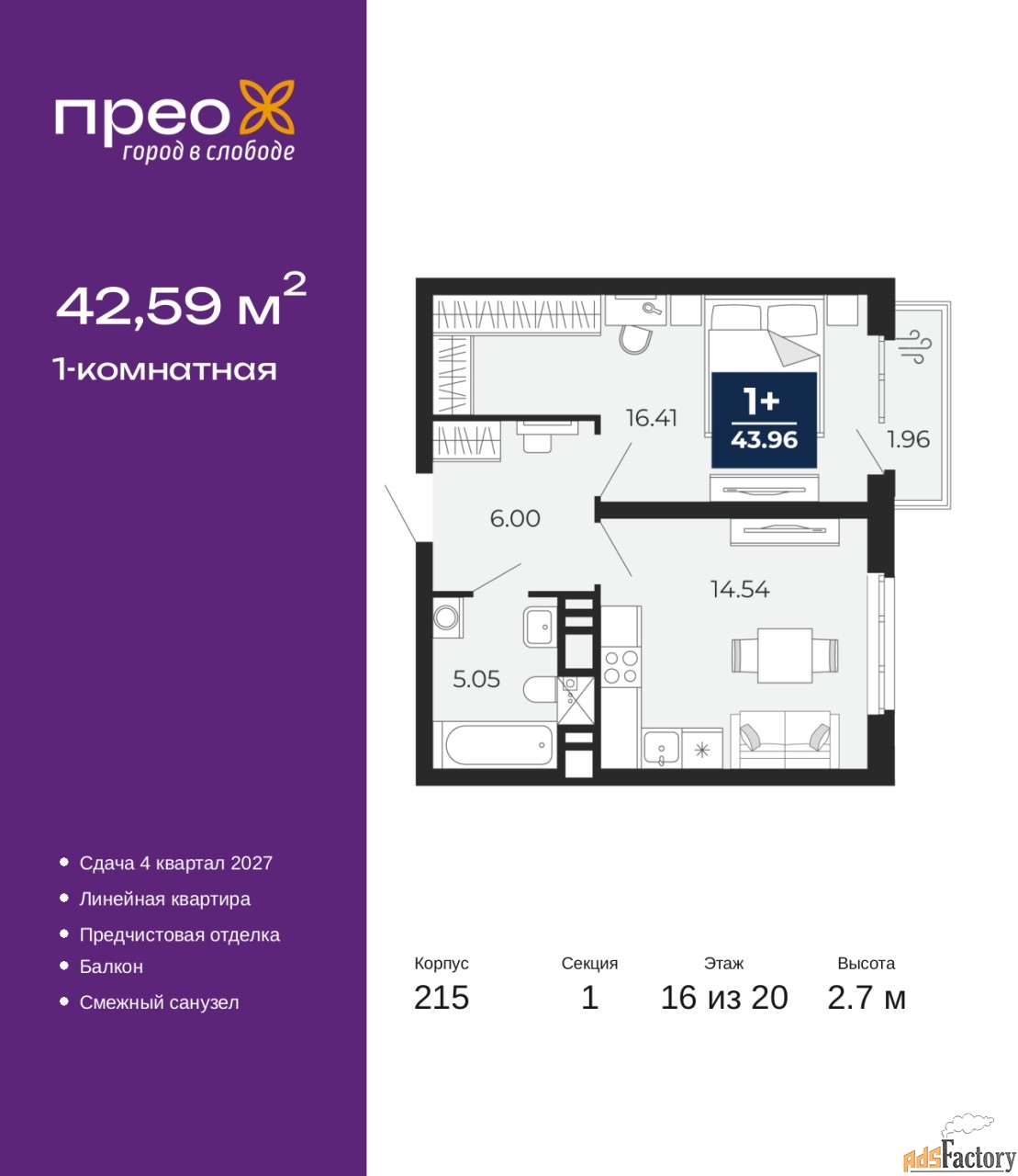 Квартира находится в корпусе 215. Дом монолитный, одноподъездный, высотой 20 этажей. На этаже 8 квартир. В подъезде 1 пассажирский и 1 грузовой лифт. Окончание строительства - 4 квартал 2027 года. Оформление сделки по договору долевого участия.