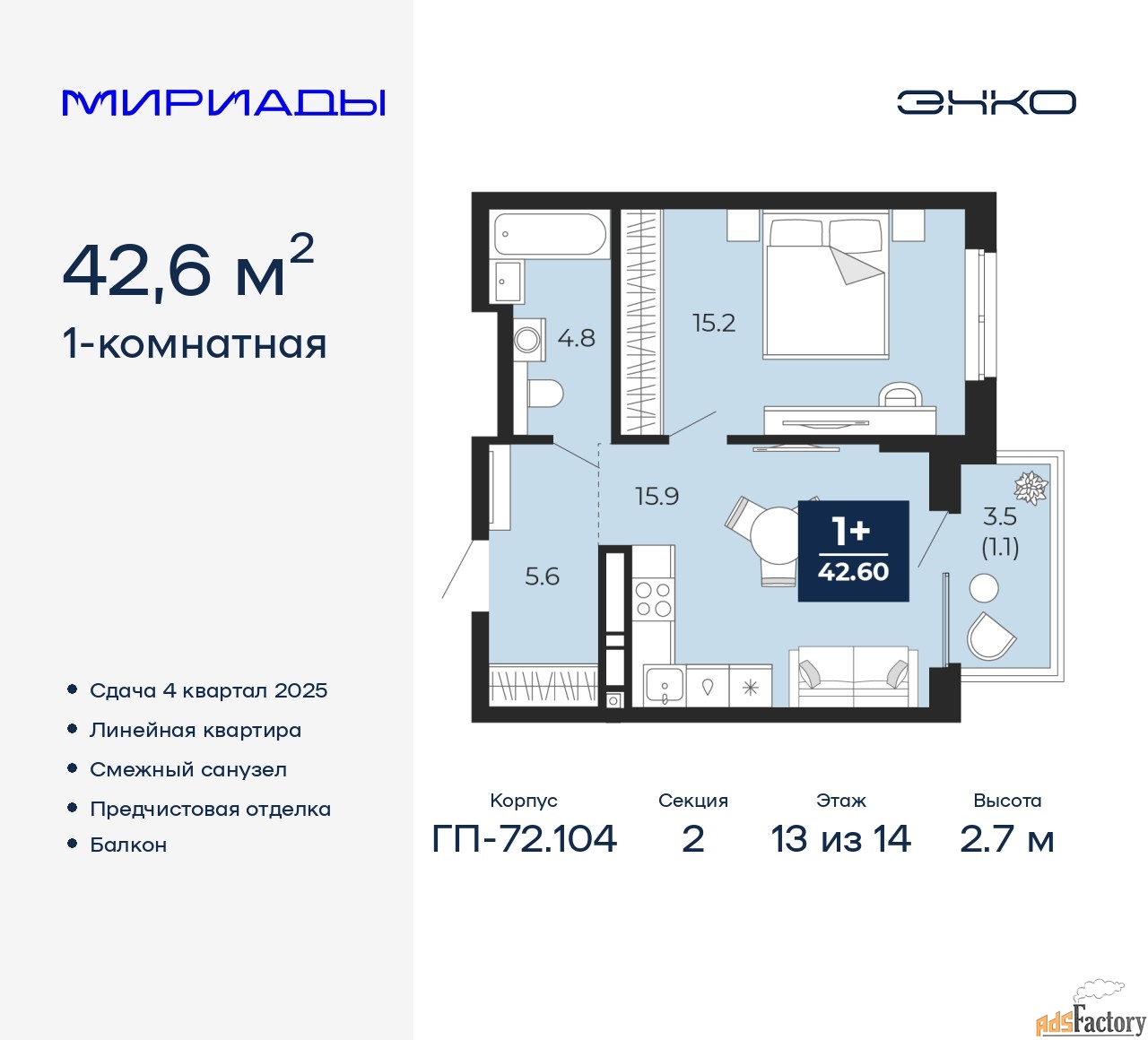 Дом монолитный, двухподъездный, переменной этажности, от 14 до 18 этажей. Квартира находится во 2-й секции высотой 14 этажей в корпусе ГП-72.104. На этаже 8 квартир. В подъезде 1 пассажирский и 1 грузовой лифт. Окончание строительства - 4 квартал 2025 года. Оформление сделки по договору долевого участия.