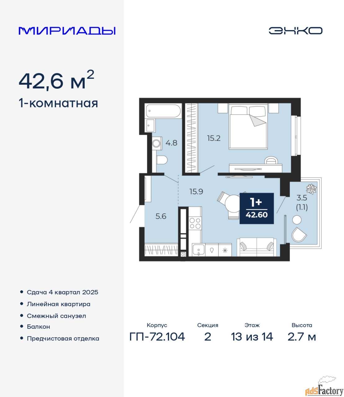 Дом монолитный, двухподъездный, переменной этажности, от 14 до 18 этажей. Квартира находится во 2-й секции высотой 14 этажей в корпусе ГП-72.104. На этаже 8 квартир. В подъезде 1 пассажирский и 1 грузовой лифт. Окончание строительства - 1 квартал 2026 года. Оформление сделки по договору долевого участия.