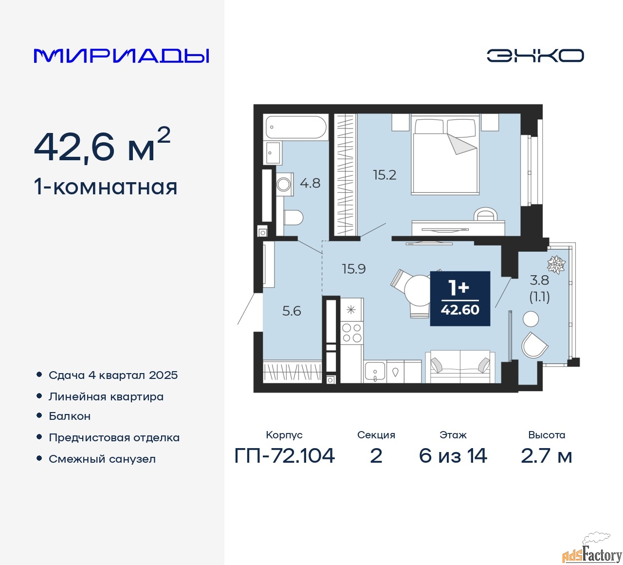 Дом монолитный, двухподъездный, переменной этажности, от 14 до 18 этажей. Квартира находится во 2-й секции высотой 14 этажей в корпусе ГП-72.104. На этаже 8 квартир. В подъезде 1 пассажирский и 1 грузовой лифт. Окончание строительства - 4 квартал 2025 года. Оформление сделки по договору долевого участия.