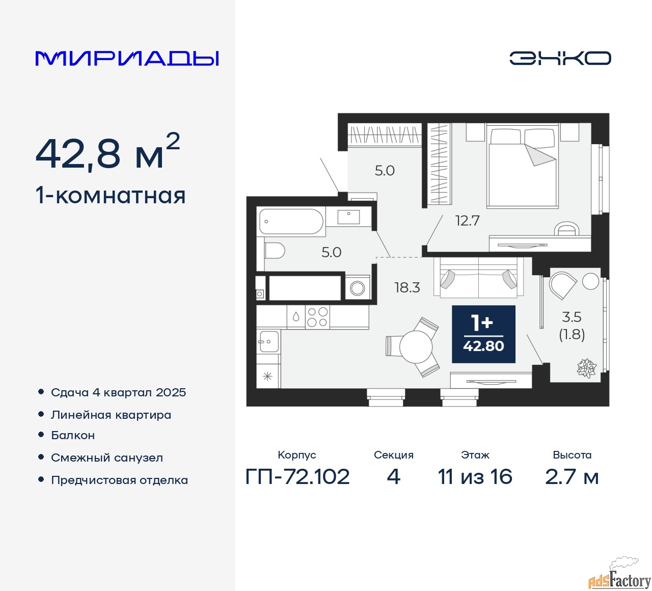 Дом монолитный, многоподъездный, переменной этажности, от 14 до 16 этажей. Квартира находится в 4-й секции высотой 16 этажей в корпусе ГП-72.102. На этаже 6 квартир. В подъезде 1 пассажирский и 1 грузовой лифт. Окончание строительства - 4 квартал 2025 года. Оформление сделки по договору долевого участия.