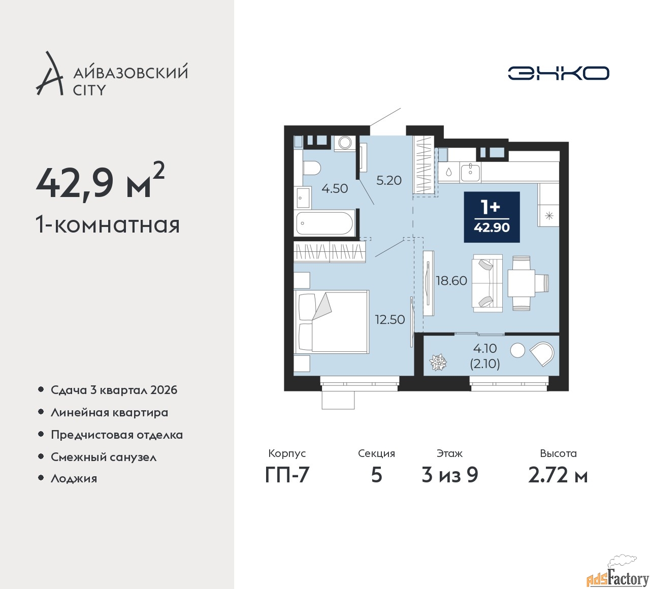 Дом монолитный, многоподъездный, переменной этажности, от 9 до 24 этажей. Квартира находится в 5-й секции высотой 9 этажей в корпусе ГП-7. На этаже 7 квартир. В подъезде 1 пассажирский и 2 грузовых лифта. Окончание строительства - 3 квартал 2026 года. Оформление сделки по договору долевого участия.