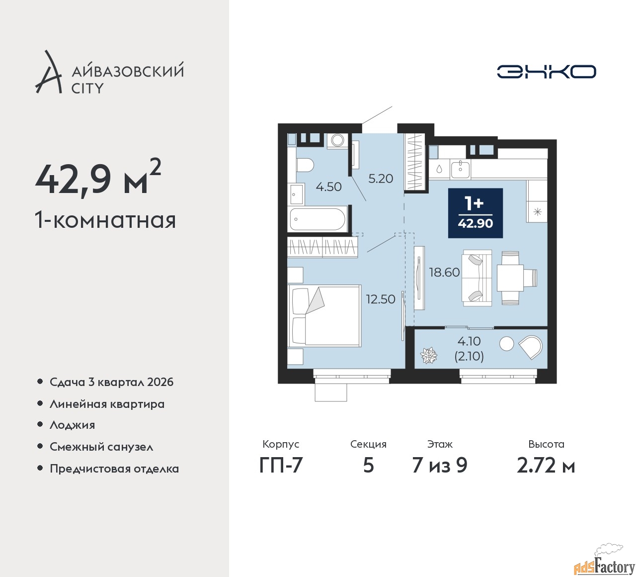 Дом монолитный, многоподъездный, переменной этажности, от 9 до 24 этажей. Квартира находится в 5-й секции высотой 9 этажей в корпусе ГП-7. На этаже 7 квартир. В подъезде 1 пассажирский и 2 грузовых лифта. Окончание строительства - 3 квартал 2026 года. Оформление сделки по договору долевого участия.
