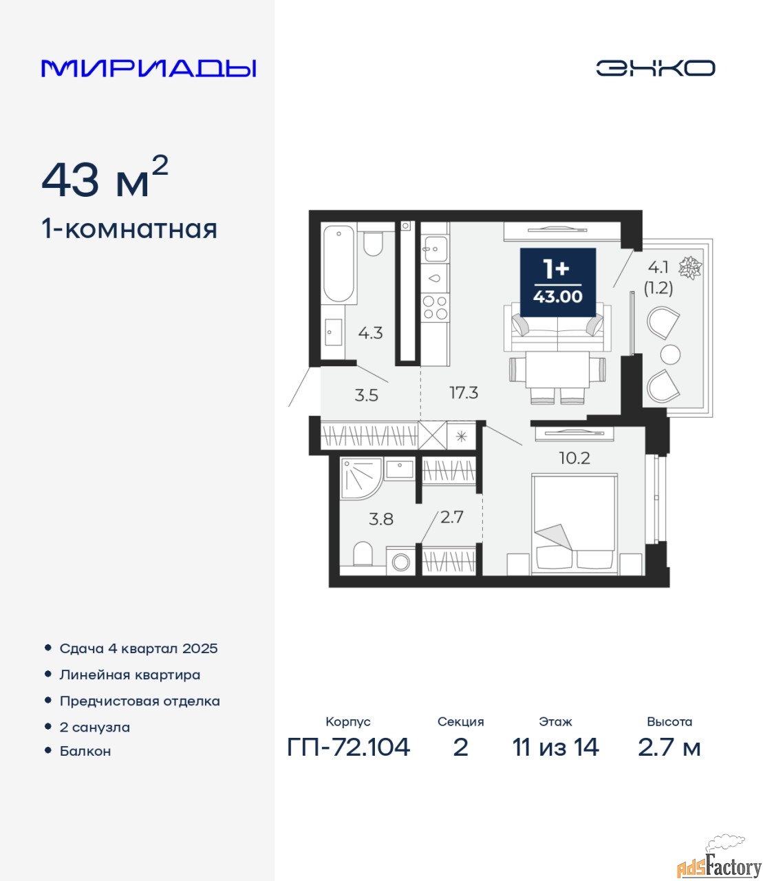Дом монолитный, двухподъездный, переменной этажности, от 14 до 18 этажей. Квартира находится во 2-й секции высотой 14 этажей в корпусе ГП-72.104. На этаже 8 квартир. В подъезде 1 пассажирский и 1 грузовой лифт. Окончание строительства - 1 квартал 2026 года. Оформление сделки по договору долевого участия.