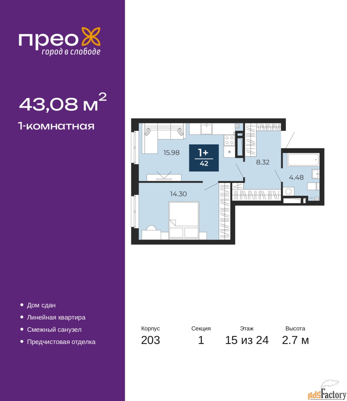 Квартира находится в корпусе 203. Дом монолитный, одноподъездный, высотой 24 этажа. На этаже 14 квартир. В подъезде 2 грузовых лифта. На сегодняшний день строительство завершено, дом сдан в 4 квартале 2024 года. Оформление сделки по договору купли-продажи.