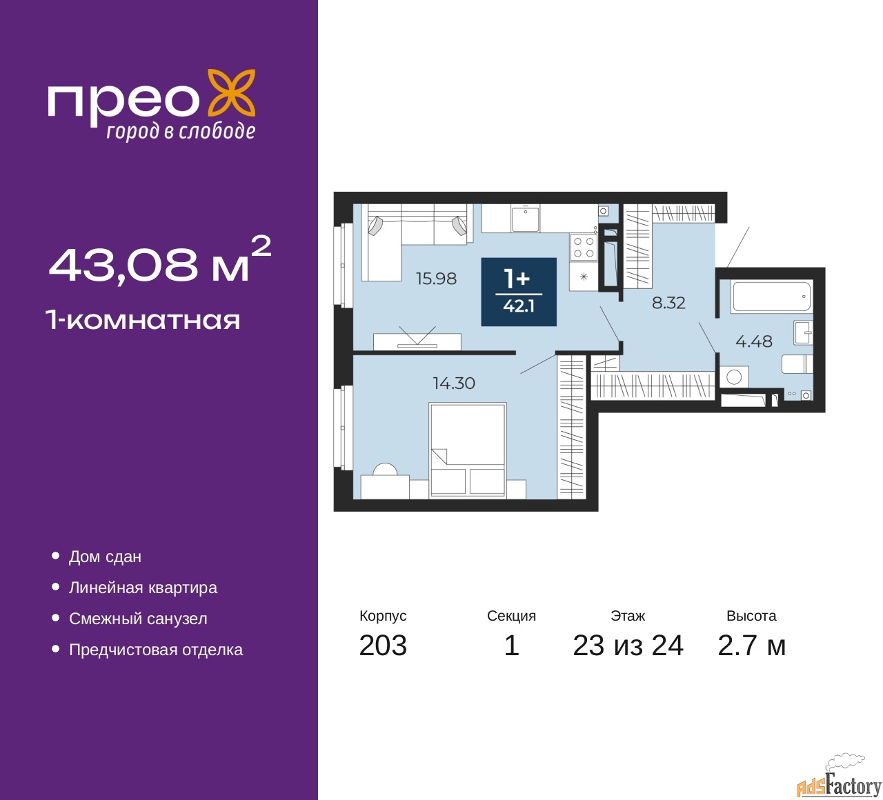 | Общая площадь (кв.м) | 43.08 |