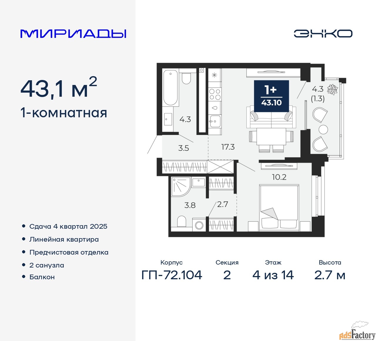 Дом монолитный, двухподъездный, переменной этажности, от 14 до 18 этажей. Квартира находится во 2-й секции высотой 14 этажей в корпусе ГП-72.104. На этаже 8 квартир. В подъезде 1 пассажирский и 1 грузовой лифт. Окончание строительства - 4 квартал 2025 года. Оформление сделки по договору долевого участия.