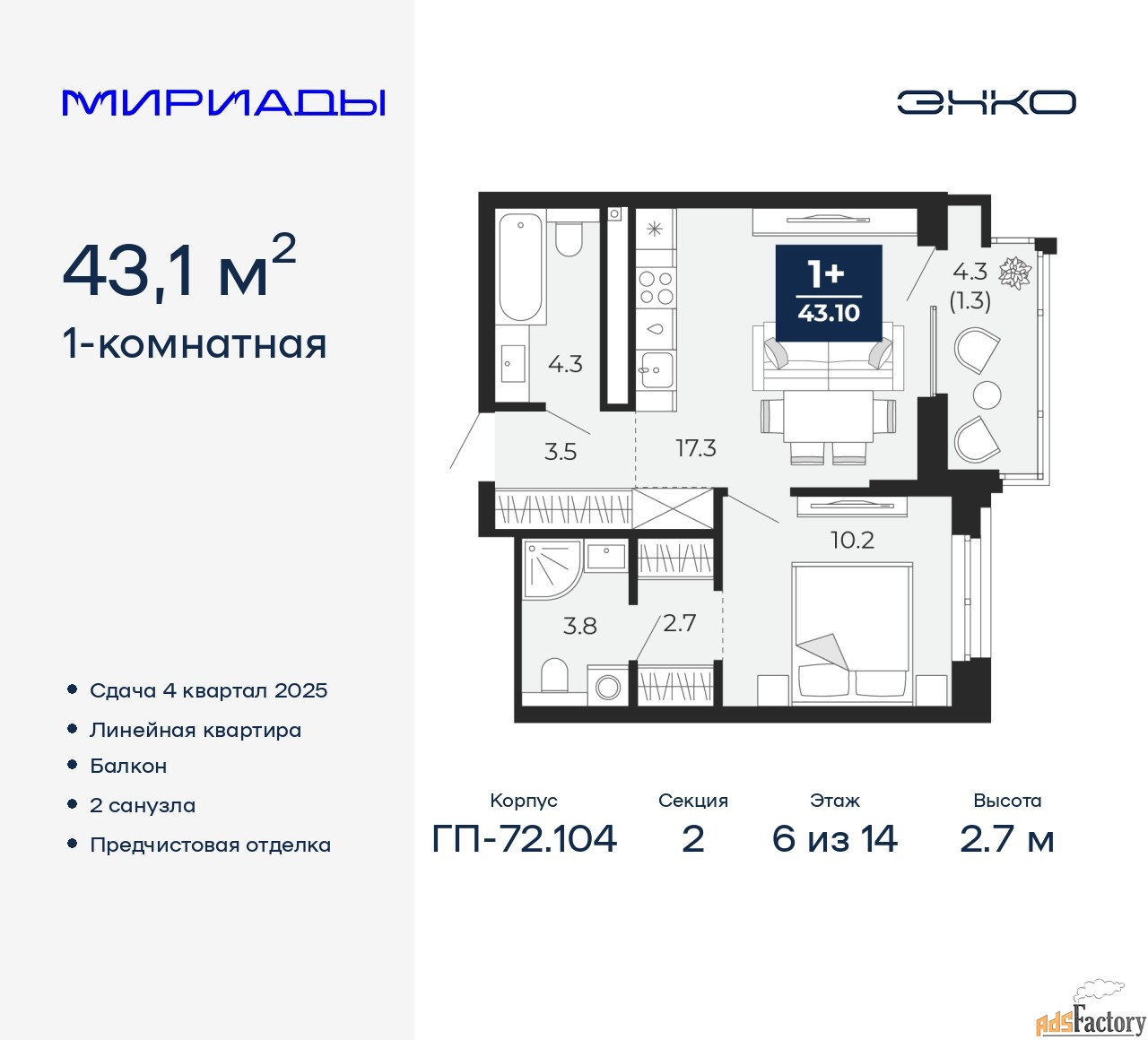 | Общая площадь (кв.м) | 43.1 |