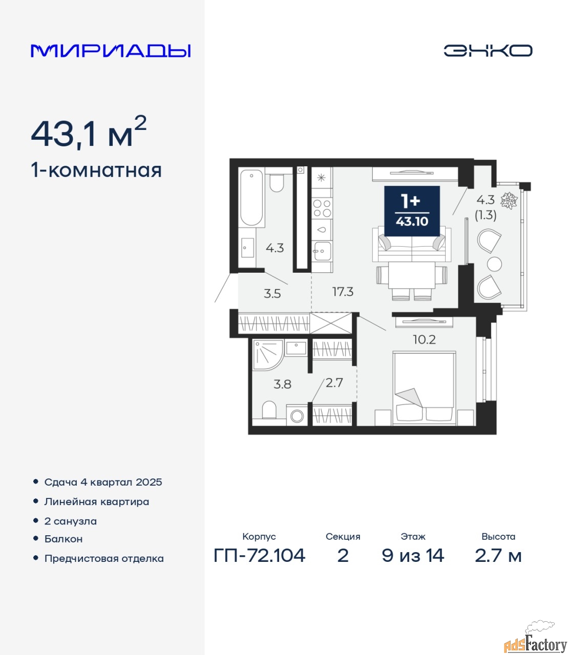 Дом монолитный, двухподъездный, переменной этажности, от 14 до 18 этажей. Квартира находится во 2-й секции высотой 14 этажей в корпусе ГП-72.104. На этаже 8 квартир. В подъезде 1 пассажирский и 1 грузовой лифт. Окончание строительства - 1 квартал 2026 года. Оформление сделки по договору долевого участия.