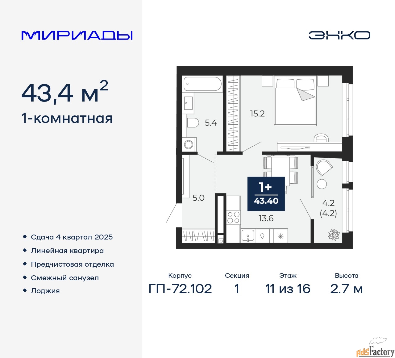 Дом монолитный, многоподъездный, переменной этажности, от 14 до 16 этажей. Квартира находится в 1-й секции высотой 16 этажей в корпусе ГП-72.102. На этаже 9 квартир. В подъезде 1 пассажирский и 1 грузовой лифт. Окончание строительства - 4 квартал 2025 года. Оформление сделки по договору долевого участия.
