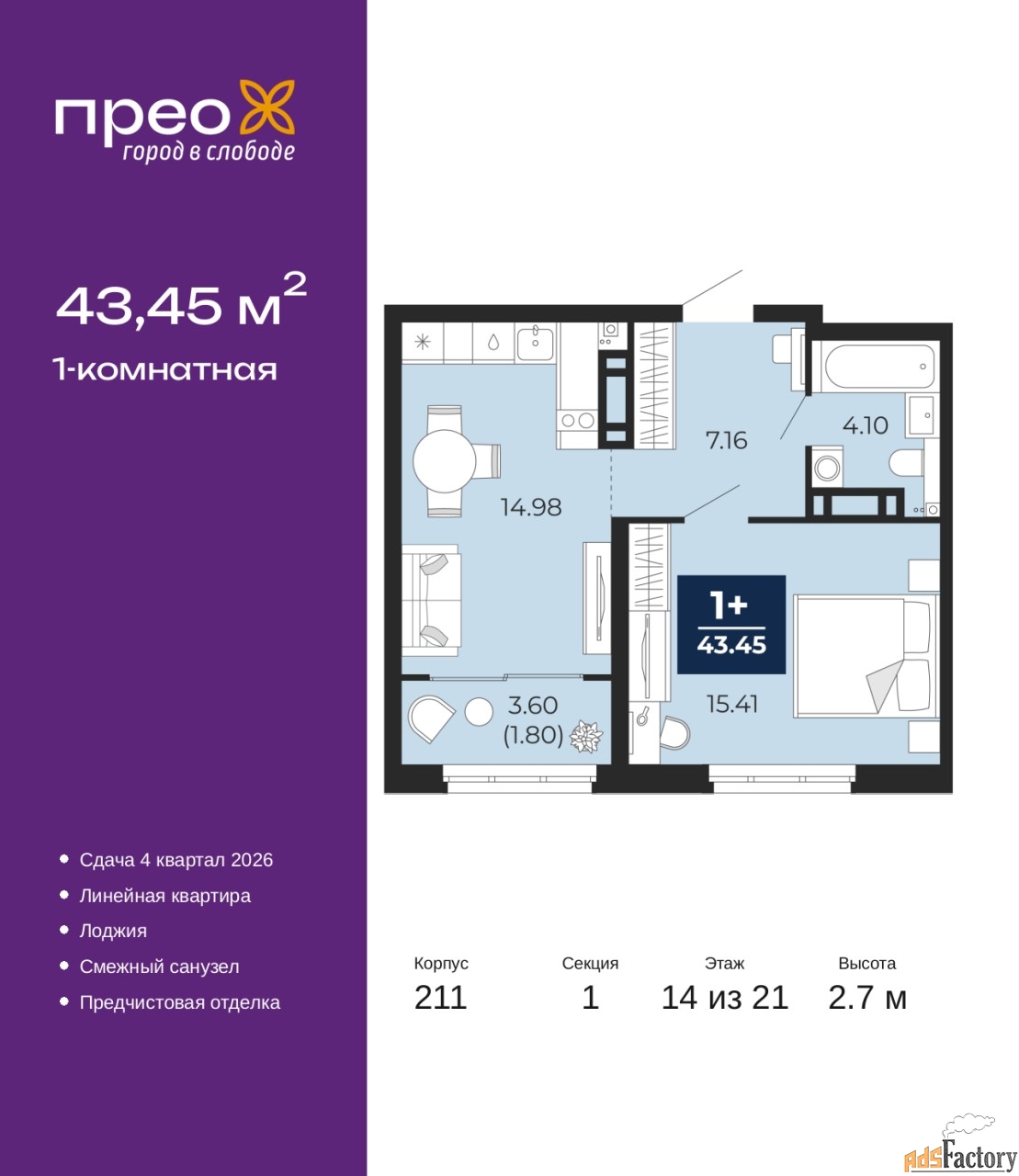 | Общая площадь (кв.м) | 43.45 |