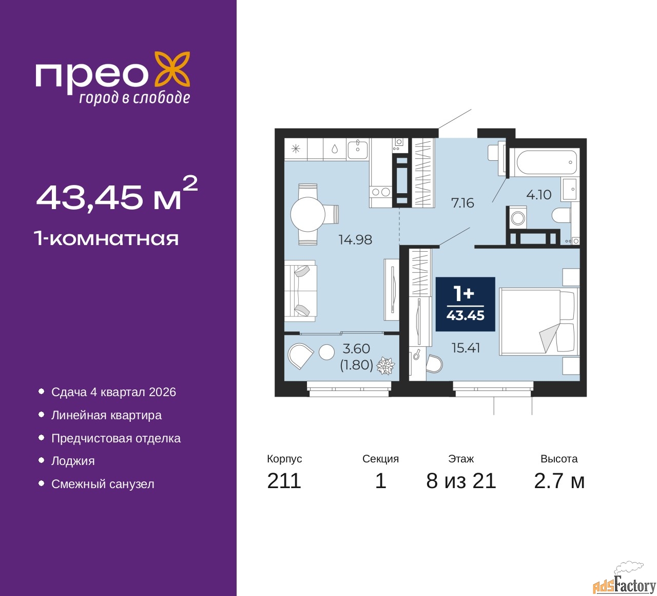 Дом монолитный, черырехподъездный, переменной этажности, от 14 до 21 этажей. Квартира находится в 1-й секции высотой 21 этаж в корпусе 211. На этаже 8 квартир. В подъезде 1 пассажирский и 1 грузовой лифт. Окончание строительства - 4 квартал 2026 года. Оформление сделки по договору долевого участия.