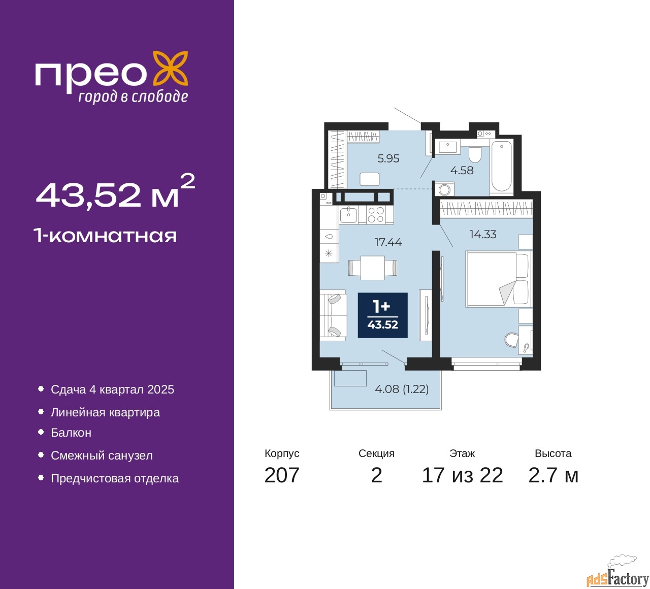 Дом монолитный, двухподъездный, высотой 22 этажа. Квартира находится во 2-й секции в корпусе 207. На этаже 8 квартир. В подъезде 1 пассажирский и 1 грузовой лифт. Окончание строительства - 4 квартал 2025 года. Оформление сделки по договору долевого участия.