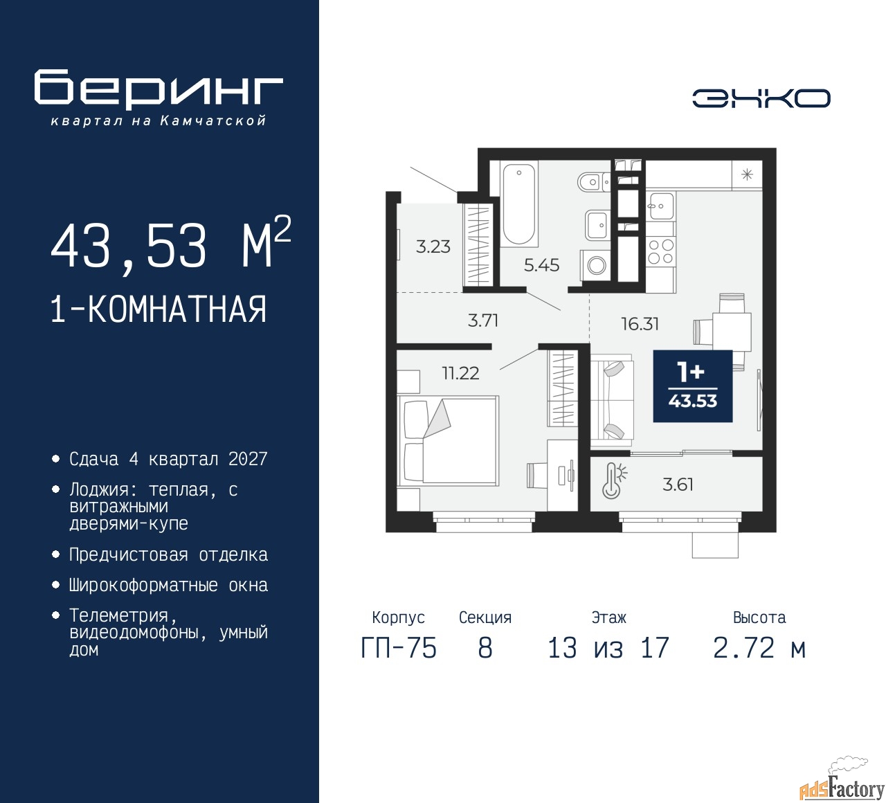 Дом монолитный, многоподъездный, переменной этажности, от 17 до 24 этажей. Квартира находится в 8-й секции высотой 17 этажей в корпусе ГП-75. На этаже 8 квартир. В подъезде 2 пассажирских и 1 грузовой лифт. Окончание строительства - 4 квартал 2027 года. Оформление сделки по договору долевого участия.