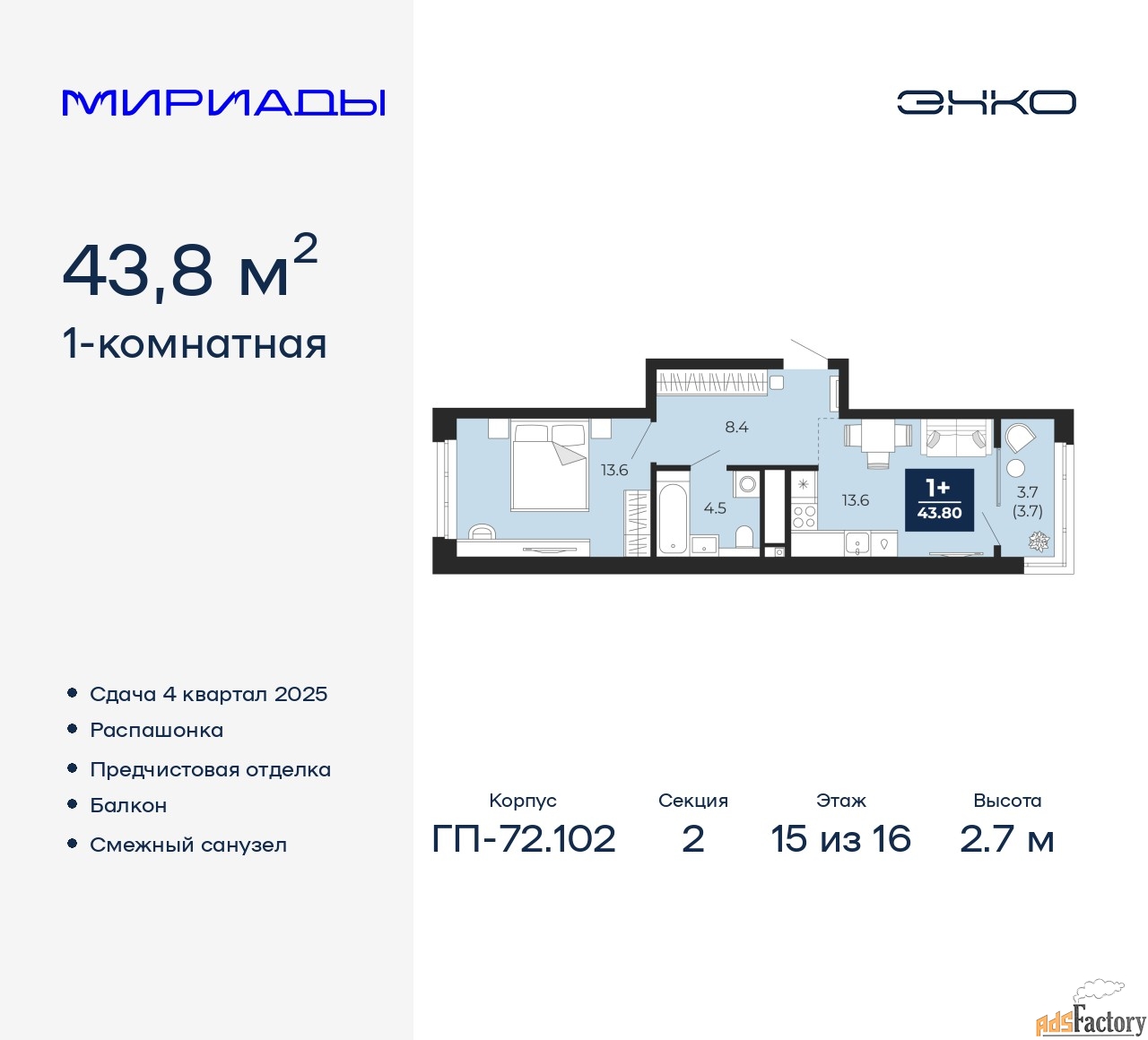 | Общая площадь (кв.м) | 43.8 |