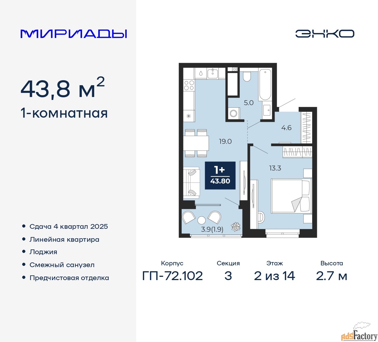 Дом монолитный, многоподъездный, переменной этажности, от 14 до 16 этажей. Квартира находится в 3-й секции высотой 14 этажей в корпусе ГП-72.102. На этаже 5 квартир. В подъезде 1 пассажирский и 1 грузовой лифт. Окончание строительства - 4 квартал 2025 года. Оформление сделки по договору долевого участия.
