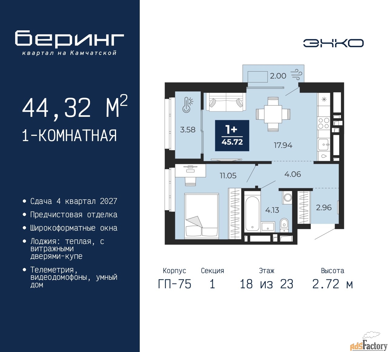 | Высота потолков (м.) | 2.72 |
