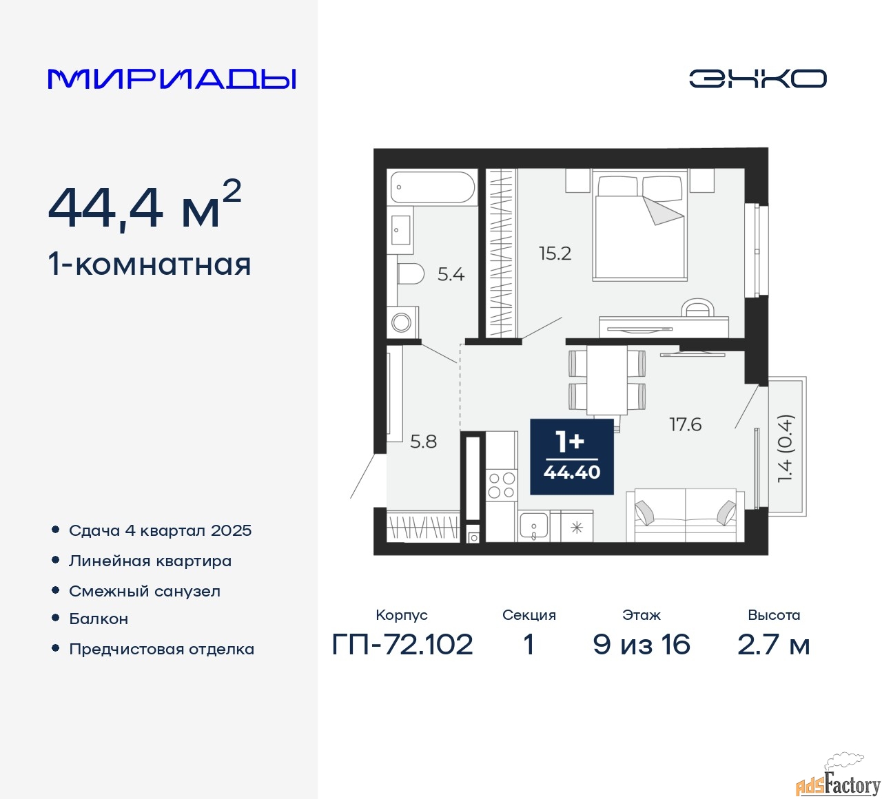 Дом монолитный, многоподъездный, переменной этажности, от 14 до 16 этажей. Квартира находится в 1-й секции высотой 16 этажей в корпусе ГП-72.102. На этаже 9 квартир. В подъезде 1 пассажирский и 1 грузовой лифт. Окончание строительства - 4 квартал 2025 года. Оформление сделки по договору долевого участия.