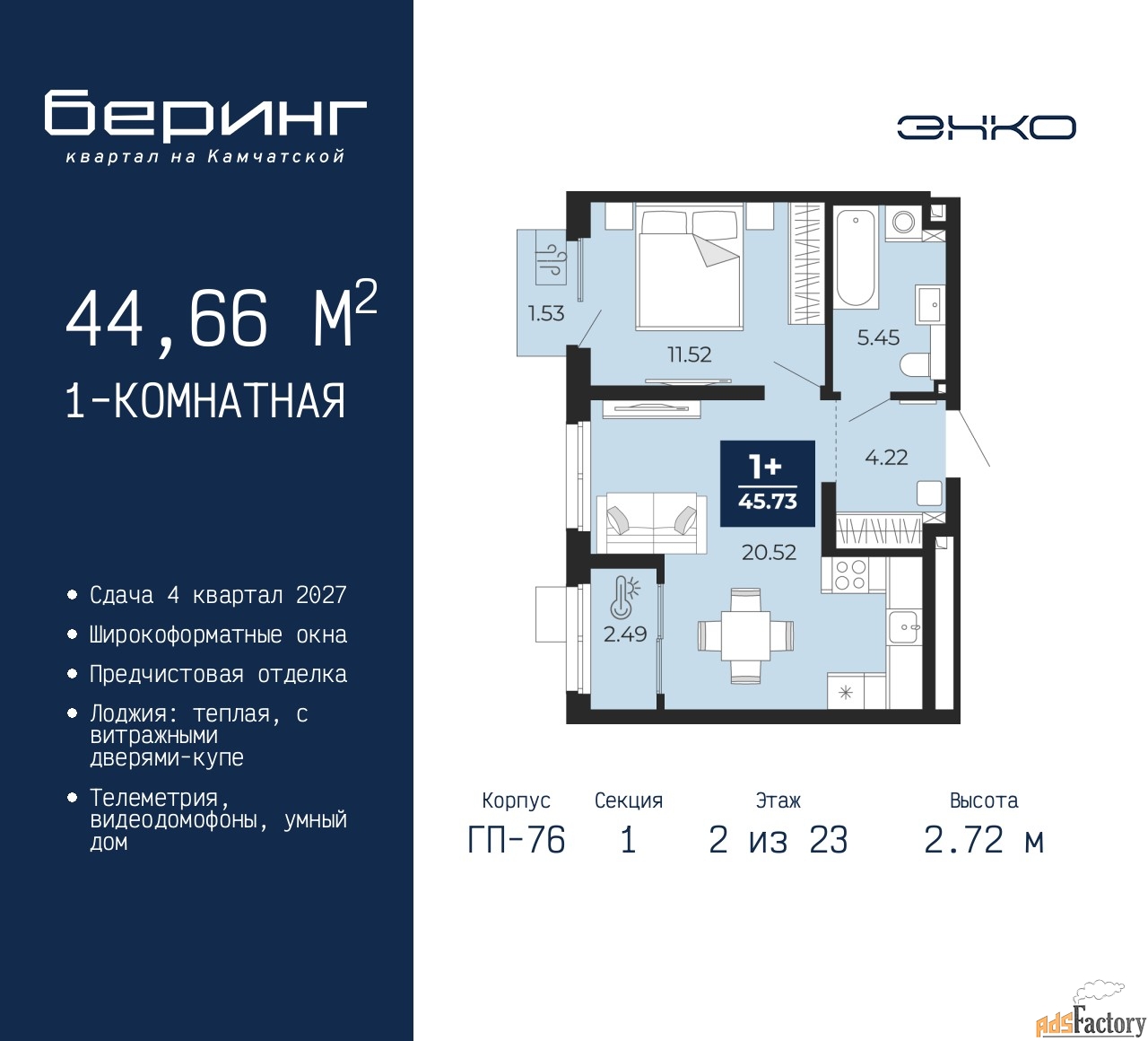 | Высота потолков (м.) | 2.72 |