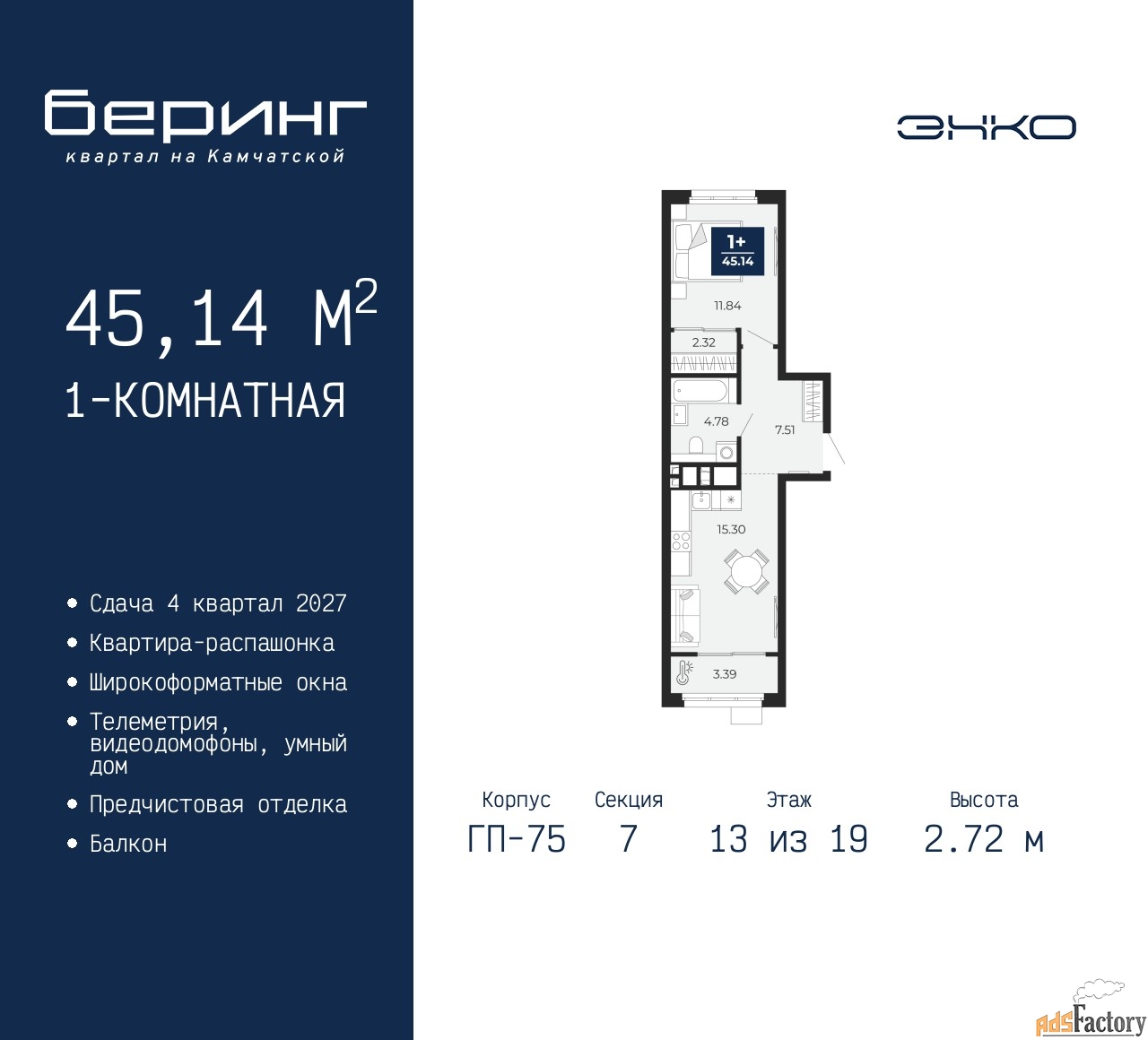 Дом монолитный, многоподъездный, переменной этажности, от 17 до 24 этажей. Квартира находится в 7-й секции высотой 19 этажей в корпусе ГП-75. На этаже 7 квартир. В подъезде 2 пассажирских и 1 грузовой лифт. Окончание строительства - 4 квартал 2027 года. Оформление сделки по договору долевого участия.