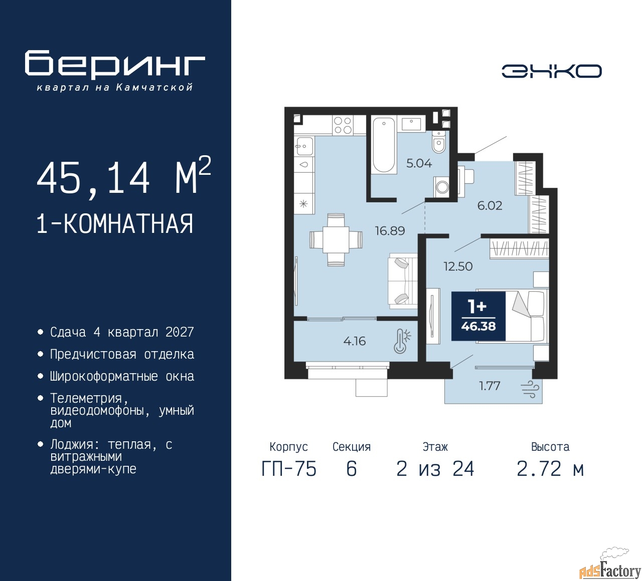 | Высота потолков (м.) | 2.72 |