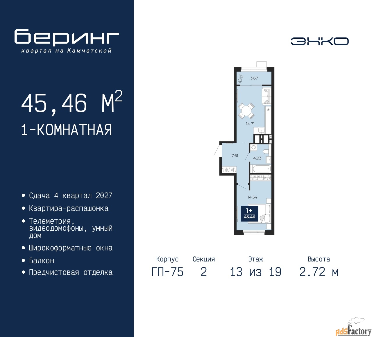 | Высота потолков (м.) | 2.72 |