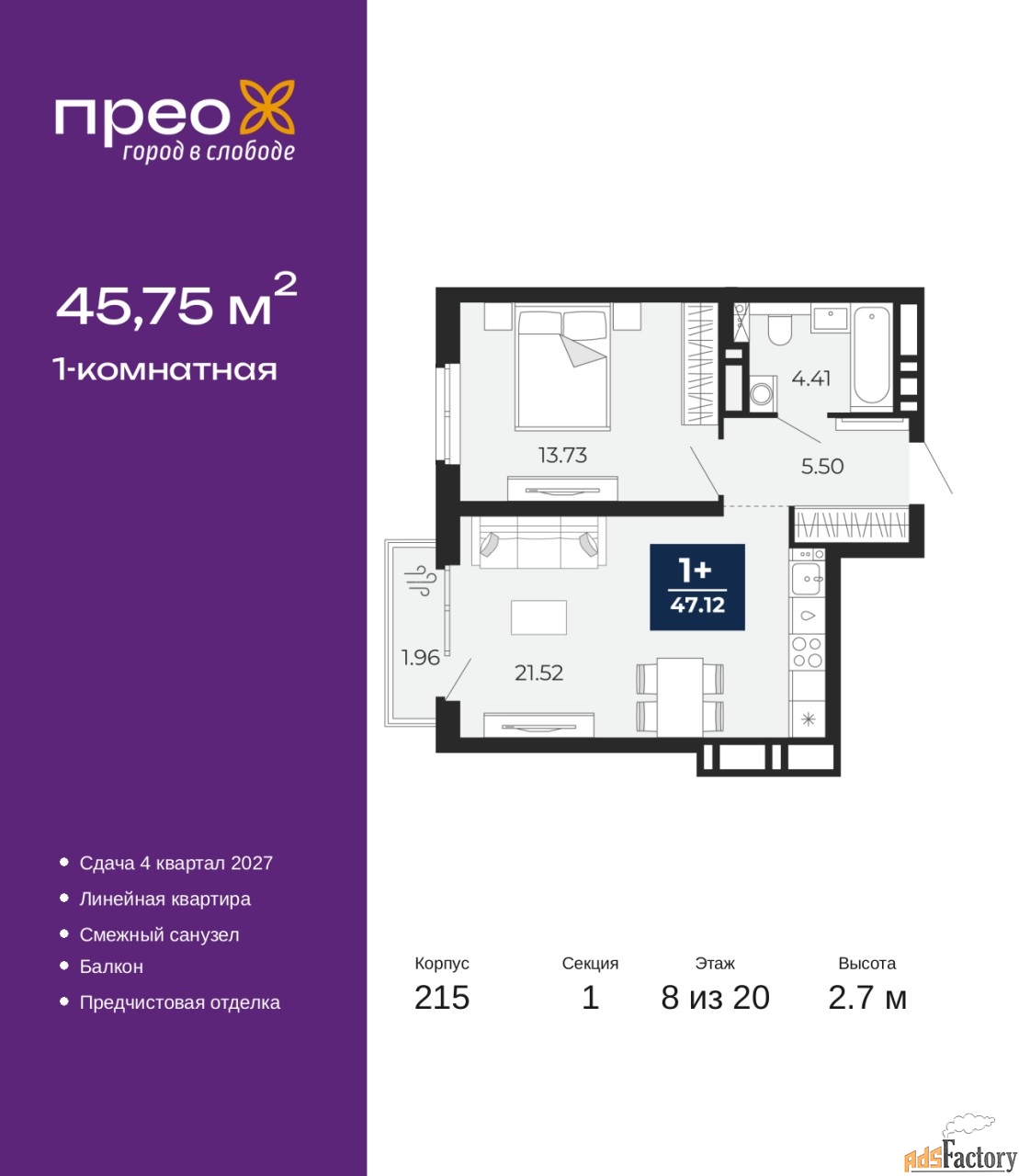 Квартира находится в корпусе 215. Дом монолитный, одноподъездный, высотой 20 этажей. На этаже 8 квартир. В подъезде 1 пассажирский и 1 грузовой лифт. Окончание строительства - 4 квартал 2027 года. Оформление сделки по договору долевого участия.