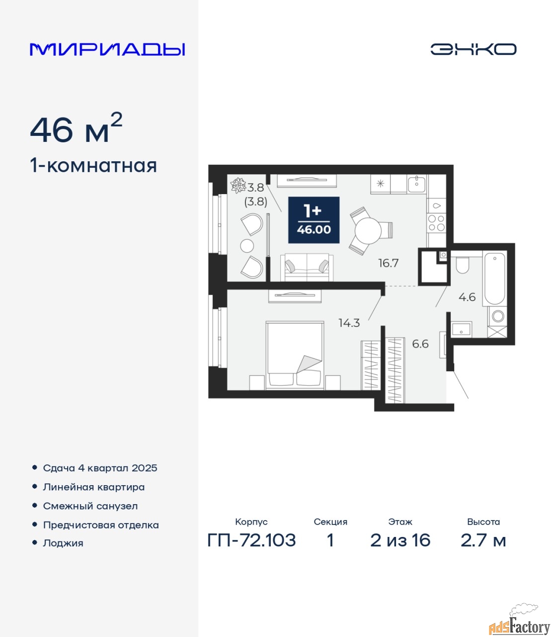 Дом монолитный, трехподъездный, переменной этажности, от 14 до 16 этажей. Квартира находится в 1-й секции высотой 16 этажей в корпусе ГП-72.103. На этаже 8 квартир. В подъезде 1 пассажирский и 1 грузовой лифт. Окончание строительства - 1 квартал 2026 года. Оформление сделки по договору долевого участия.