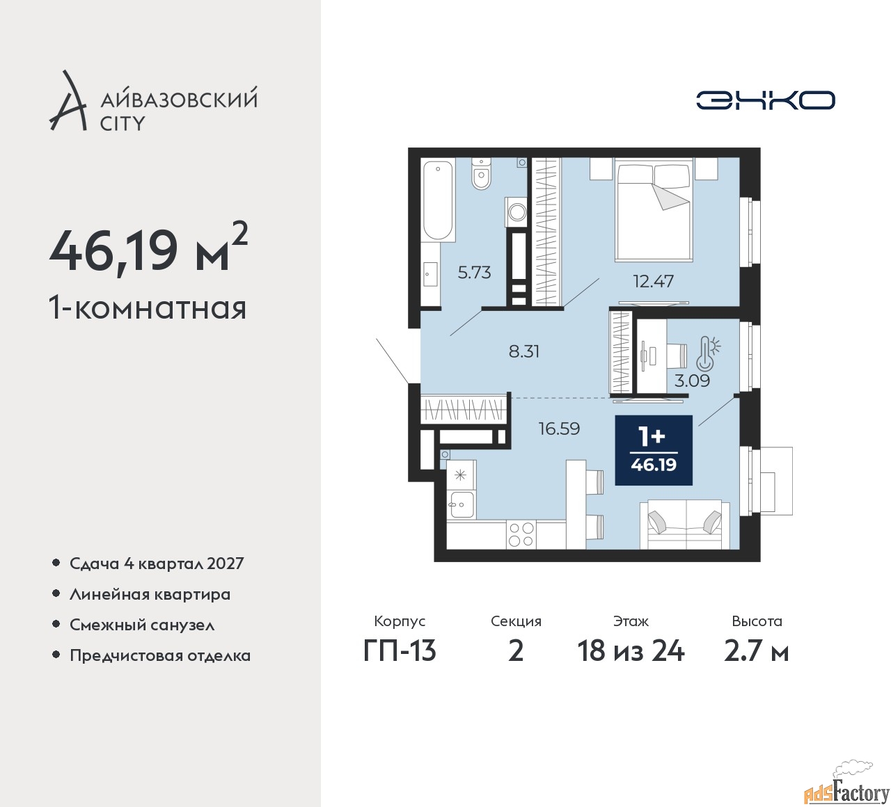 Дом монолитный, многоподъездный, высотой 24 этажа. Квартира находится во 2-й секции в корпусе ГП-13. На этаже 6 квартир. В подъезде 1 пассажирский и 1 грузовой лифт. Окончание строительства - 4 квартал 2027 года. Оформление сделки по договору долевого участия.