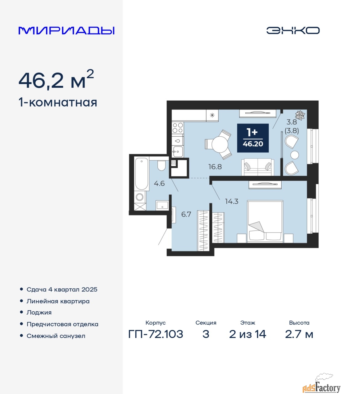 Дом монолитный, трехподъездный, переменной этажности, от 14 до 16 этажей. Квартира находится в 3-й секции высотой 14 этажей в корпусе ГП-72.103. На этаже 8 квартир. В подъезде 1 пассажирский и 1 грузовой лифт. Окончание строительства - 1 квартал 2026 года. Оформление сделки по договору долевого участия.