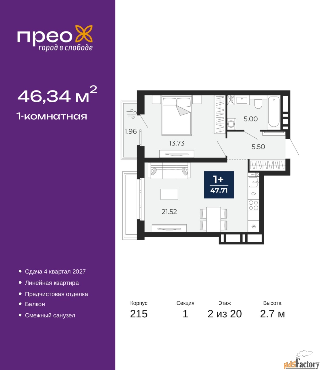 Квартира находится в корпусе 215. Дом монолитный, одноподъездный, высотой 20 этажей. На этаже 8 квартир. В подъезде 1 пассажирский и 1 грузовой лифт. Окончание строительства - 4 квартал 2027 года. Оформление сделки по договору долевого участия.