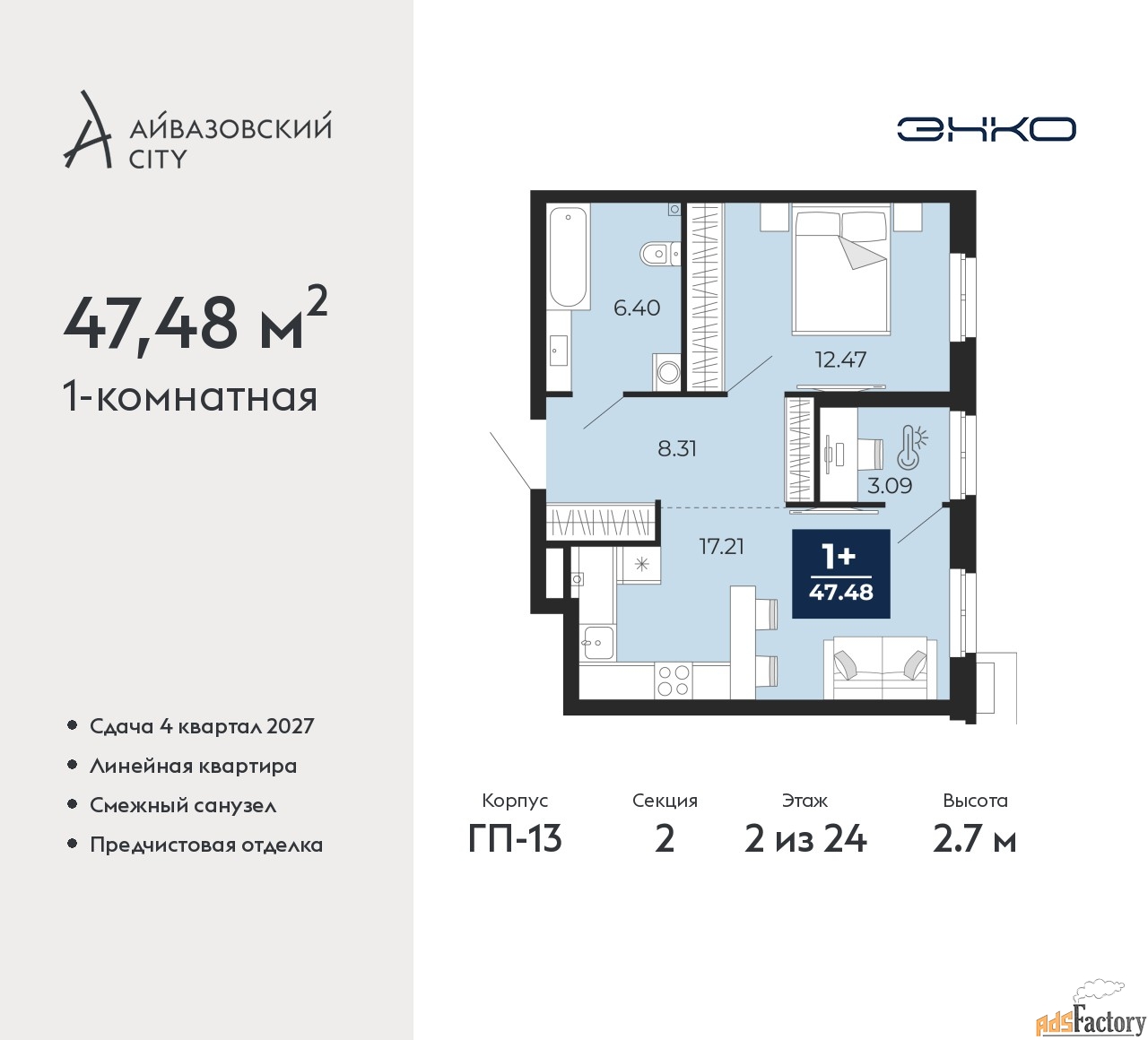 Дом монолитный, многоподъездный, высотой 24 этажа. Квартира находится во 2-й секции в корпусе ГП-13. На этаже 6 квартир. В подъезде 1 пассажирский и 1 грузовой лифт. Окончание строительства - 4 квартал 2027 года. Оформление сделки по договору долевого участия.